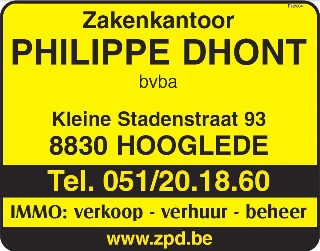 The agency Dhont Philippe Zakenkantoor is located in 8830 Hooglede. At the moment, Dhont Philippe Zakenkantoor proposes4 properties for sale, 9 properties for rent. Want to know more?