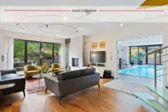 This exceptional residence in Niederanven is for sale at a price of €3,950,000. Built in 2010, the property spans a plot of 9a 40ca and boasts a total area of approximately 555sqm, with a living area of around 420sqm. The house's unique interior design allows for a variety of living options, facilitated by a lift in the entrance hall that connects all four levels, including access to a separate apartment on the first floor and the basement. The property features an indoor pool measuring 8m x 4m with a counter-current swimming system, alongside a sauna, adding to its exclusivity. The residence is thoughtfully laid out across four levels. On the ground floor, there is a spacious entrance hall with lift access and an open-plan "Leicht" kitchen and dining room that seamlessly integrates into the living space. The wellness area adjoins this space, complete with the pool and sauna, as well as a shower and separate WC. This level also provides access to the terrace and garden areas. The first floor comprises a master suite with direct lift access, including an office space, dressing room, and shower room. Additionally, there are three more bedrooms, two of which have en-suite shower rooms, along with a storage room. Located in the highly sought-after municipality of Niederanven, the property benefits from excellent infrastructure. It is conveniently situated close to the motorway network, Luxembourg City, Kirchberg, and the airport. The area offers comprehensive amenities such as bakeries, a pharmacy, restaurants, and the shopping centre "Les Arcades" with various shops. Educational facilities are top-notch, with "Am Sand" primary school, a music school, and various day-care centres nearby. Niederanven provides numerous leisure activities including the Tennis Club Senningerberg and Syrdall Schwemm aquatic centre. The surrounding areas are perfect for walks or cycling tours, with paths extending to Luxembourg, Echternach, or the Moselle. Want to know more?
