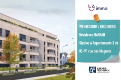 LA Immo real estate agency is pleased to present the BANYAN Residence, a unique real estate project by the renowned developer Arend & Fischbach, nestled in the heart of the sought-after Weimershof district, on rue des Muguets. This studio is located on the first floor and is arranged as follows: an open space combining the living and sleeping areas, with access to a pleasant terrace, as well as a shower room with toilet. A place where modernity and comfort meet, offering a truly new living experience. This exceptional quality project is brought to you by Arend & Fischbach, a highly regarded developer known for expertise, precision, and attention to detail, ensuring top-of-the-line finishes and lasting durability. The BANYAN Residence offers a range of modern and elegant homes, thoughtfully designed to suit all lifestyles, whether for harmonious everyday living or as a promising real estate investment. Highlights of the residence: Strategic location A peaceful and residential setting, just steps from the European institutions, shops, schools, and free public transport, offering easy access to all of Luxembourg. Refined design Contemporary architecture, high-quality materials, and meticulous finishes that combine elegance and functionality for a timeless and harmonious living environment. The BANYAN Residence is a rare opportunity, a place where life is good, while offering a secure and lasting investment in one of the most desirable areas of the capital. Do not hesitate to contact us for more information by calling ### or by writing to ### Want to know more?