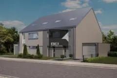 Wiesen Piront offers: Beautiful family house in future construction as an NZEB (Nearly Zero Energy Building), located on a plot of approximately 2.74 ares in the new "In der Stolzheck" housing estate in Hesidorf, municipality of Steinsel. Heat pump This modernly designed house offers a total surface area of 165 m² and a total habitable area of 137 m². The property is arranged as follows: The ground floor includes an entrance hall, a garage for one car, and a master bedroom with a private bathroom. Then an open-plan kitchen and living area with access to the terrace (via sliding doors), a laundry room, a separate WC, and a technical room. The upper floor comprises two bedrooms, a separate WC, and a bathroom. *Selling price: €1,216,624 – 3% VAT included ) Price not subject to indexation *) Subject to approval by the Registration Administration. Want to know more?