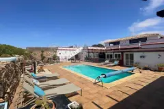 The villa is located at the edge of a quiet village, in the center of the sunny volcanic island Fuerteventura. The accommodation is directly adjacent to a large volcanic nature park, is very quietly located and yet close (5 km) to a town with all the necessary amenities. From the terrace you have a beautiful view of the volcanic crater there. The villa has a touristic (VV) license and is ideal for use as a bed and breakfast or holiday home. However, the accommodation can certainly also be used for other commercial purposes or as a large family home. You can move in and get started right away. 𝐋𝐚𝐲𝐨𝐮𝐭 The current layout of the interior of the accommodation consists of two parts: a living area and a guest area, which are separated by an interior door. Living area: ▶️ Hallway ▶️ Large, very modern kitchen with all necessary appliances ▶️ Living room ▶️ Double bedroom with en-suite bathroom Guest area: ▶️ A total of 7 bedrooms, 5 of which are double rooms and 2 are single rooms (1 single room is located in a separate building in the front garden) ▶️ All rooms have their own en-suite bathroom ▶️ General (breakfast) room ▶️ Second, smaller kitchen with built-in appliances ▶️ Large covered enclosed veranda with direct view of the terrace/pool ▶️ Large (50 m2) multifunctional room (on the first floor) ▶️ Entrance for guests with a separate office and separate laundry room with 2 washing machines and 1 dryer ▶️ Storage / utility room Outdoor space: ▶️ Heated swimming pool (south-facing and fully fenced) ▶️ Large terrace, partly covered with a pergola ▶️ Sauna (with electric heating) ▶️ Large, beautifully landscaped garden with several fruit trees ▶️ Covered parking for 3 cars 𝐆𝐚𝐫𝐝𝐞𝐧 / 𝐨𝐮𝐭𝐝𝐨𝐨𝐫 𝐬𝐩𝐚𝐜𝐞𝐬 The villa is situated on a flat, rectangular plot that is completely walled with natural stone, shielding it from the surroundings. This ensures optimal privacy for residents and guests. In the front garden, you will find a beautiful mature garden with palm trees, yuccas, various types of cacti (trees), agaves and fruit trees (mangoes, limes, avocados, papayas, bananas and a large olive tree). Invisible from the road/neighbours, there is a large terrace with a heated swimming pool (over 20 m2), facing south. Here you can enjoy the view and the abundant sunshine in complete privacy. The adjacent pergola provides the necessary shade. 𝐌𝐚𝐢𝐧 𝐜𝐡𝐚𝐫𝐚𝐜𝐭𝐞𝐫𝐢𝐬𝐭𝐢𝐜𝐬 𝐨𝐟 𝐭𝐡𝐞 𝐯𝐢𝐥𝐥𝐚 👍The villa is connected to the mains drainage system. 👍Satellite internet is available (approx. 150 Mb/s). 👍All electrical wiring has been professionally installed or renewed in recent years. 👍The water supply was renewed 5 years ago and installed above ground. 👍The accommodation has 10 solar panels with a total capacity of 3 kW. Furthermore, the water is heated by 2 solar boilers. All this means that energy costs are minimal for an accommodation of this size. 👍Thanks to a state-of-the-art, all the water in the accommodation is drinkable, very clean and “soft”, which means that equipment lasts much longer. 👍All exterior windows have been replaced with aluminium (no maintenance) and double glazing over the past 2 years. Most exterior windows also have roller shutters. 𝐅𝐮𝐞𝐫𝐭𝐞𝐯𝐞𝐧𝐭𝐮𝐫𝐚 (𝐂𝐚𝐧𝐚𝐫𝐲 𝐈𝐬𝐥𝐚𝐧𝐝𝐬) Fuerteventura has over 3,000 hours of sunshine per year, making it one of the sunniest locations in Europe. The frequent winds ensure a pleasant climate, even in the summer months. It is the second largest island and has relatively few inhabitants, making it much quieter than Tenerife or Gran Canaria, for example. It is also known as a very safe place. The accommodation is very centrally located on the island: the nearest beach is approx. 15 minutes away, the airport 25 minutes. Both the far north and south are 60 minutes away. There are many opportunities for walking or cycling in the immediate vicinity of the property, which (thanks to the favourable climate) is possible almost all year round. Want to know more?