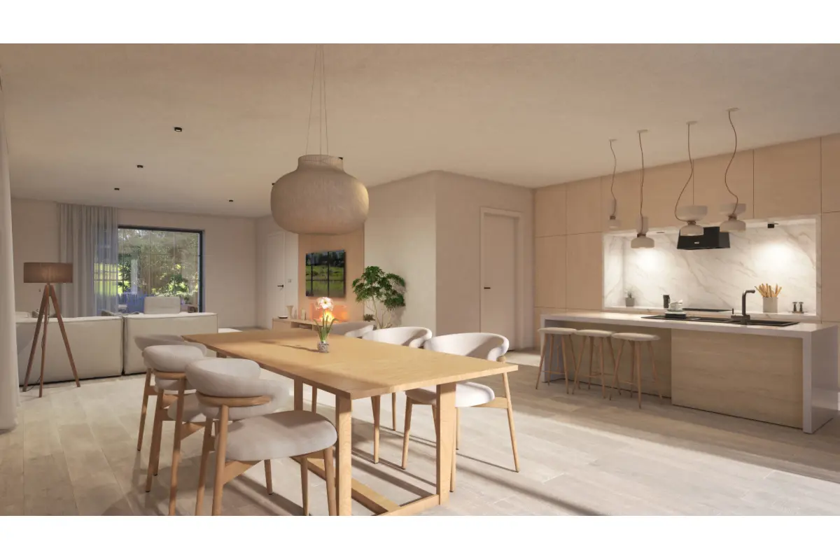 De woning wordt VOLLEDIG AFGEWERKT (naar eigen smaak!) met zeer kwalitatieve materialen. Ook is de woning voorzien van een warmtepomp, vloerverwarming, zonnepanelen, regenwaterput met pomp, enz...