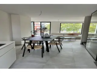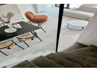 De doorlopende leefruimte met zijn grote raampartijen op niveau 1, laat maximaal zonlicht binnen aan beide gevelzijden. Strakheid is hier troef met als leuk detail een glazen scheidingswand ter hoogte van de trap.
