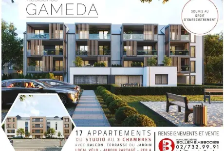 CAUTION | STARTING PRICE ! REGISTRATION FEE (12.5% maximum) The GAMEDA Residence is part of a search for modernity and comfort for its occupants. Close to the main roads, the Jambes train station, as well as just 7 minutes from the center of Namur, the location of your future apartment is ideal. From studios to 3 bedrooms with garden, each apartment in the Residence provides its occupants with an outdoor space (Terrace or Garden), bicycle storage and a shared green space. For even more accessibility and comfort, 14 secure car parks and 6 garages are offered at an additional cost. Customizable IXINA kitchens, PEB A and many other advantages... Contact us: Tel 0472/59.51.81