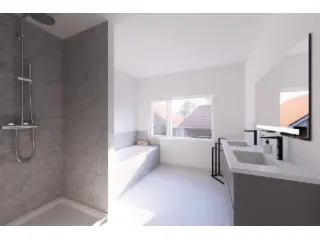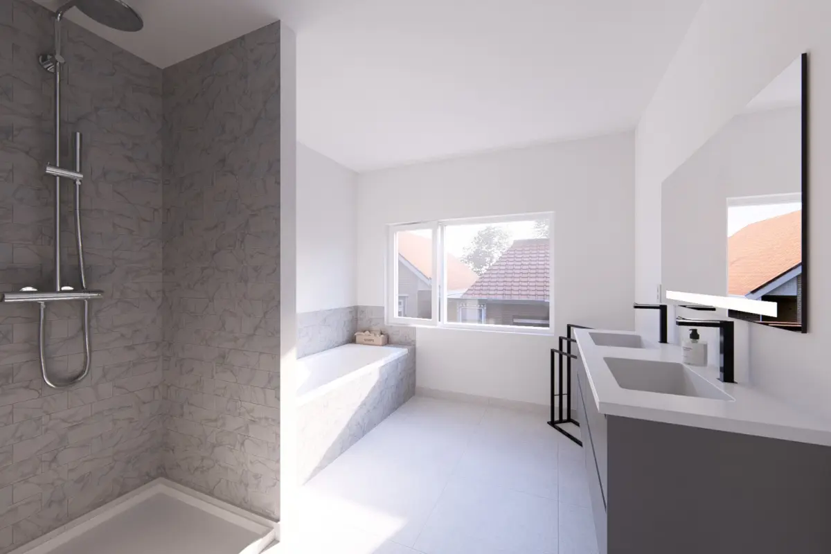 - Menuiseries : châssis PVC double-vitrage, portes intérieures prêtes à peindre, tablettes de fenêtre en marbre blanc ou en pierre bleue, escalier en hêtre