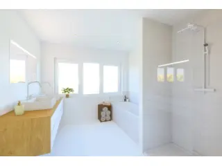- Revêtements de sol : carrelage dans la pièce de vie et dans la salle de bain, parquet dans les chambres, carrelage anti-graisse pour le garage