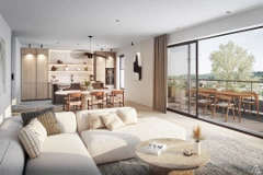 WOLUWE-SAINT-LAMBERT – Ideally located in a sought-after neighborhood, on the edge of a Natura 2000 zone along the Woluwe and just steps away from the charming Chemin de Vellemolen, Parc Malou, the Woluwe Shopping Center, and all amenities (Roodebeek Metro, Bus, Tram 8, RO/E40, airport, Cliniques St Luc,...), magnificent NEW LUXURY APARTMENT (1bed/1shower) of 79.8 m², benefiting from a southwest-facing TERRACE of 14 m², a southeast-facing PRIVATE GARDEN of 80 m², and a large SHARED GARDEN. Located on the ground floor, it consists of an entrance hall with guest WC, a bright living room of 31.5 m² with fully equipped open kitchen opening onto the terrace and garden, a technical room, a laundry room, a 15.3 m² bedroom with adjoining shower room (sink, Italian shower, WC). This apartment, with its modern and timeless architecture, stands out for its high level of finishes (custom-made woodwork and kitchen by ModulNova by FLAMANT, underfloor heating, video surveillance,...). Special attention has also been paid to the use of sustainable materials and technologies ensuring excellent energy and acoustic performance (private solar panels, advanced insulation, triple glazing, rainwater harvesting,...). EPC A to A+. Cellar mandatory at extra cost and optional parking. Sale of the land under registration duties (12.5%) and of the constructions under VAT (21%). To discover at L&P! Want to know more?
