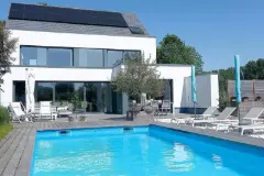 Are you dreaming of space, luxury, and tranquillity surrounded by nature? Then this exceptional design villa is exactly what you’re looking for. Situated on a beautiful 1,880 m² plot, just outside the village centre of a peaceful community in the Ninove – Geraardsbergen – Galmaarden region, this property offers complete privacy combined with excellent accessibility. Built using only high-end materials and advanced construction techniques, this modern villa is finished to perfection in every detail. The thoughtful architecture – with a closed front facade and an open rear with large glass surfaces – ensures an abundance of natural light and maximises the connection with the surrounding landscape. From all living spaces, you can enjoy stunning views of the inviting terrace, the heated swimming pool, and the expansive garden, which seamlessly blends into the meadows and fields beyond. The location, near the Raspaillebos forest and the recreational domain “De Gavers”, makes this villa the perfect retreat for those who appreciate peace, nature, and outdoor living. Layout: • Ground floor: spacious entrance hall with reception desk, cloakroom, and guest toilet; bright living area with lounge and dining space; luxury open-plan kitchen with cooking island and adjacent pantry/laundry room. Additionally, there are 2 large bedrooms with en-suite bathrooms and direct access to the terrace. • First floor: night hall leading to 3 bedrooms, including a master suite of 39 m² with dressing room and private bathroom. Each bedroom comes with its own en-suite bathroom and toilet. • Second floor: 1 additional bedrooms, 1 bathroom with toilet, and extra storage space. One of the rooms is currently used as a playroom. In total, the villa offers 6 bedrooms and 6 bathrooms, providing exceptional living flexibility — ideal for large families, co-housing, or a combination of residential and professional use (e.g. liberal profession or private practice). Outdoors, you can enjoy a landscaped garden, several sun-drenched terraces, a heated swimming pool, and parking space for at least 5 cars at the front of the property. Why choose this villa? • Luxurious living area of approx. 480 m² • Excellent energy efficiency and insulation • Unique architecture with clean lines and abundant natural light • Peaceful location near nature and all essential amenities • Perfect for private and/or professional use • Additional features: underfloor heating, security system, dual ventilation, solar panels, heat pump, fire-resistant doors, and more ________________________________________ Book your viewing today and experience the unique character of this remarkable villa for yourself. An exclusive opportunity for those who settle for nothing but the best. Want to know more?