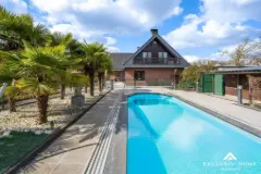 This timeless villa is located in a quiet cul-de-sac near the Dender, just outside the village center of Wieze – a charming town located between Aalst and Dendermonde. Peace and privacy are guaranteed thanks to the favorable positioning of the home and the enclosed rear garden. The property sits on a plot of 2,200 m², with a living area of over 300 m². The ground floor offers a spacious entrance hall with guest toilet and cloakroom area, a home office, a cosy living room with fireplace and dining area, a fully equipped kitchen and an integrated double garage. On the first floor, there are five spacious bedrooms, including two with a balcony and one with a private dressing room. The property has two bathrooms: one with a shower, and one with both a shower and a bathtub. One of the bathrooms is accessible from both the hallway and directly from a bedroom. The beautifully landscaped sun terrace with palm trees, the pool house with heated swimming pool, and the garden shed of no less than 80 m² invite you to relax in total privacy. The property is energy-efficient (EPC A – 84 kWh/m²), asbestos-safe, and has a compliant electrical installation. This villa is in immaculate condition and offers endless possibilities. Perfect as a family home for a large household, or even as a multigenerational (kangaroo) home. In short, a rare opportunity for anyone looking for a stylish, high-quality and move-in-ready villa in a peaceful, green setting. Want to know more?