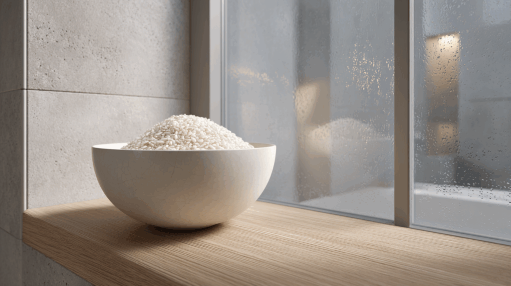 On le connaît surtout dans l’assiette, un peu moins comme absorbeur d’humidité naturel. Et pourtant, le riz blanc possède un fort pouvoir absorbant. Ce n’est pas pour rien qu’il est souvent conseillé pour sauver un téléphone tombé dans l’eau ! Appliqué à la salle de bain, le principe est exactement le même : capter l’excès d’humidité présent dans l’air pour assainir l’atmosphère.