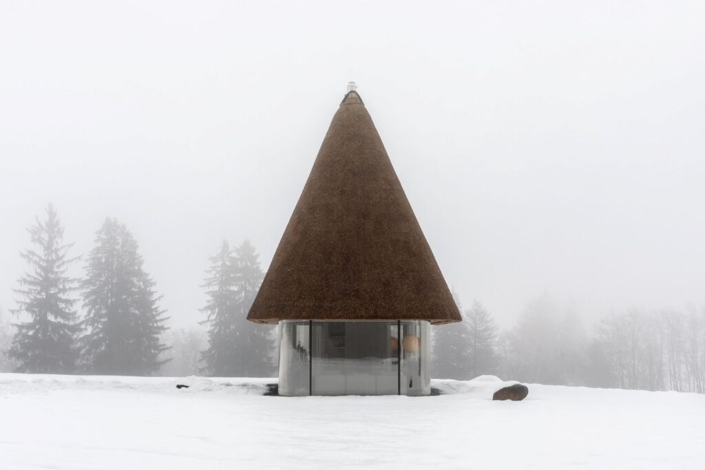 Historiquement, la mazanka repose sur des principes simples : murs épais blanchis à la chaux, toiture massive et un entretien très rigoureux pour maintenir l’ensemble en parfait état. Ici, le studio conserve l’ADN… mais en inverse les codes. Résultat : une maison presque entièrement transparente, où la lumière remplace les murs et où le paysage devient décor permanent !