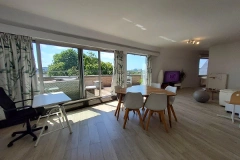 Cet agréable appartement meublé de ± 96 m² au premier étage séduit par sa luminosité, son confort et sa configuration fonctionnelle. Idéalement pensé pour un couple ou une petite famille, il offre un cadre de vie pratique et convivial. Dès l’entrée, vous découvrez un grand salon/salle à manger, parfait pour recevoir ou se détendre, qui s’ouvre directement sur une terrasse couverte, offrant un espace extérieur agréable en toute saison. La cuisine équipée complète l’espace de vie et permet de préparer vos repas en toute commodité. Côté nuit, l’appartement propose deux chambres confortables, ou une chambre + bureau selon vos besoins : • Une première chambre spacieuse, parfaite pour un espace intime. • Une seconde chambre ou bureau, idéale pour travailler à domicile ou accueillir des invités. La salle de bain est fonctionnelle et accompagnée d’une toilette séparée, pour plus de confort au quotidien. Informations pratiques : • PEB : C+ • Disponible immédiatement • Charges communes : 140 € (entretien des communs, etc.) • Charges individuelles : électricité, eau et gaz En savoir plus ?