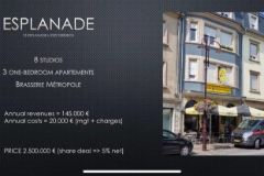 L'agence immobilière Chaves vous présente ce magnifique immeuble situé à Diekirch 13 rue de L'Esplanade. Actuellement loué et avec un revenu annuel de 145.000 euros, l'immeuble est composé comme suit: 8 studios et 3 appartements (206m2) avec une chambre à coucher, qui sont loués à l'Etat. Au Rez de chaussée (65m2) un commerce loué à la Brasserie. Les dépenses annuelles s'élèvent à 20.000 euros (mgt+charges) 2.250.000 euros (share deal = 5% net) En savoir plus ?