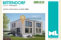 Nouveau projet résidentiel à [BETTENDORF] – Lotissement « RUE AM KRIPPEL » (Maisons modernes, lumineuses et conçues pour un confort durable) B IMMOBILIER, en collaboration avec Arend & Fischbach, promoteur luxembourgeois actif depuis plus de 30 ans, vous propose un nouveau lotissement résidentiel de standing situé dans un environnement calme et privilégié. Reconnue pour la qualité de ses constructions, la durabilité des matériaux utilisés et le respect des standards énergétiques les plus exigeants, la société Arend & Fischbach a développé au fil des années plusieurs milliers de logements au Luxembourg. Elle offre ainsi à ses acquéreurs un investissement fiable, durable et sécurisé. Plus d’informations sur le promoteur : ### --> Localisation Adresse : [RUE AM KRIPPEL] – [BETTENDORF] Un quartier apprécié pour sa qualité de vie, ses espaces verts, sa tranquillité et ses commerces de proximité, tout en restant parfaitement connecté aux principaux axes et services. --> Informations générales - Promoteur : Arend & Fischbach - Nombre d’unités : [2] maisons unifamiliales jumelées - Type de construction : VEFA (Future construction) - Standard énergétique: NZEB – Nearly Zero Energy Building - Stationnement : Carport - Extérieurs : Terrasses + Jardins privatifs --> Maison – Lot N° [B] - Type : Maison individuelle jumelée - Surface habitable : [± 125 m²] - Surface terrain : [± 2,75 ares] - Terrasse et jardin privatif inclus --> Distribution indicative : Rez-de-chaussée : - Hall d'entrée: 5.42 m2 - Local compteurs: 6.04 m2 - Réserve: 7.95 m2 - Cuisine ouverte sur la salle à manger + séjour: 41.90 m2 - Toilette séparée: 2,19 m2 Premier étage : - Hall de nuit: 4.59 m2 - Suite parentale avec dressing: 17.26 m2 - Salle de bains: 7.21 m2 - Toilette séparée: 1,90 m2 - Buanderie: 4,60 m2 - Chambre à coucher: 13.55 m2 - Chambre à coucher: 13.15 m2 Extérieur : - Carport pour une voiture + emplacement extérieur (Possibilité d’adaptations intérieures selon l’avancement du chantier.) Prestations haut de gamme selon cahier des charges (Prix affiché avec TVA 3% sous condition d’occupation principale) --> Points forts du lotissement - Cadre résidentiel calme et verdoyant - Architecture moderne & finitions soignées - Haute performance énergétique = confort + économies - Accès facilité aux écoles, crèches, commerces & services - Mobilité simple : bus, pistes cyclables, accès rapide aux axes routiers - Un investissement sûr & durable signé Arend & Fischbach Intéressé ? Contactez-nous B IMMOBILIER Agences : Diekirch & Merl Tél. : ### Email : ### --> Découvrez nos offres : ### – Sous toutes réserves – (Les images, surfaces et prix peuvent être soumis à modifications.) En savoir plus ?