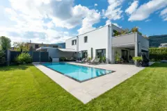 Vivre moderne et de caractère - le design rencontre la qualité de vie Cette propriété exclusive de 6,5 pièces convainc par son architecture intemporelle, ses matériaux de haute qualité et son agencement bien pensé - idéal pour les familles, les couples ou la vie et le travail sous un même toit. Au rez-de-chaussée, vous trouverez un salon, une salle à manger et une cuisine ouverts avec un accès direct au jardin, à la terrasse et à l’élégant salon autour de la piscine. Une pièce séparée est idéale comme bureau à domicile ou chambre d’amis. Deux salles de bains conçues avec goût - dont une salle de bains privative dans la zone principale - offrent un confort de haut niveau. À l’étage supérieur se trouve votre retraite privée : une chambre principale spacieuse avec dressing ouvert et accès direct à la terrasse privée sur le toit avec bain à remous. Deux autres chambres offrent beaucoup d’espace pour les enfants, les invités ou des idées d’utilisation flexibles - toutes les chambres sont inondées de lumière et équipées à un niveau élevé. Le sous-sol surprend avec un espace spa privé comprenant sauna, zone de remise en forme et espace de détente. Ceci est complété par une cave à vin conçue avec amour avec un salon attenant - une pièce avec charme et atmosphère. Des zones utilitaires et techniques, des espaces de rangement supplémentaires et une sortie directe sur l’extérieur complètent le concept d’espace harmonieux. L’espace extérieur inspire par son style méditerranéen, sa salle à manger couverte, son barbecue et sa cheminée ainsi qu’un éclairage de jardin bien pensé - intimité, esthétique et confort extérieur en parfaite harmonie. Remarque : Cette courte description vous offre un premier aperçu de la propriété. Vous trouverez des informations détaillées, d’autres photos et la description complète de la propriété dans l’exposé détaillé. L’équipe de SPI se réjouit de vous rencontrer ! En savoir plus ?