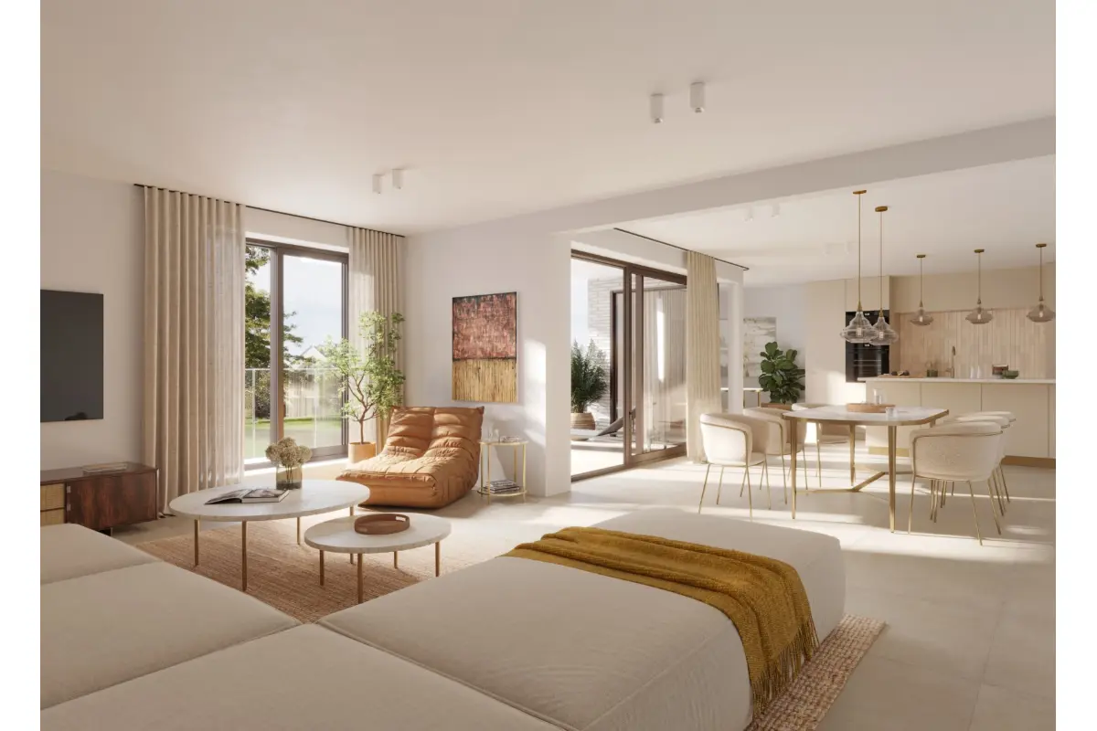 Elk appartement beschikt over een ruim terras of privatieve tuin op het westen, ideaal om te ontspannen in de zon. De gemeenschappelijke tuin vormt een groene oase voor bewoners, terwijl 8 bovengrondse autostaanplaatsen en een fietsenstalling dagelijks comfort garanderen.