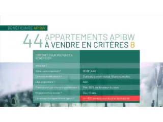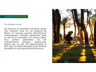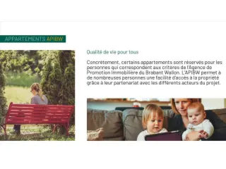 ENCORE quelques beaux appartements à vendre sous conditions -Né de la reconversion de l’ancien site Folon à Wavre, Val Véna offre un concept novateur en Brabant wallon permettant à de nombreuses personnes une facilité d’accès à la propriété en offrant des prix inférieurs au marché grâce au partenariat entre l’Agence de Promotion Immobilière du Brabant wallon (APIBW) et le promoteur du projet.Ce nouveau quartier est la combinaison parfaite entre les facilités qu’offrent la vie urbaine de Wavre et le calme d’un environnement verdoyant garantissant quiétude et bien être à ses habitants. Les logements Val Véna (1ch au 3ch et penthouse) sont entourés d’écoles de qualité, de nombreux commerces, d’une gare ferroviaire, d’un centre sportif et culturel tout en préservant l’intimité et le confort. Les plans sont travaillés de manière à ce que les bâtiments procurent à chacun ; ventilation, ensoleillement et éclairage naturel. Avec son style contemporain, Val Véna offre tous les avantages d’une construction neuve répondant aux normes les plus récentes. Chaque appartement profite d’une belle terrasse. Au programme, des finitions de qualités : parquet et carrelage de qualité dans toutes les pièces, cuisine et salle de bains équipées et buanderie , le tout dans un style moderne et tendance. Le parc au centre de Val Véna incite à la balade et à la circulation douce (à vélo, à pieds, en transport en commun).