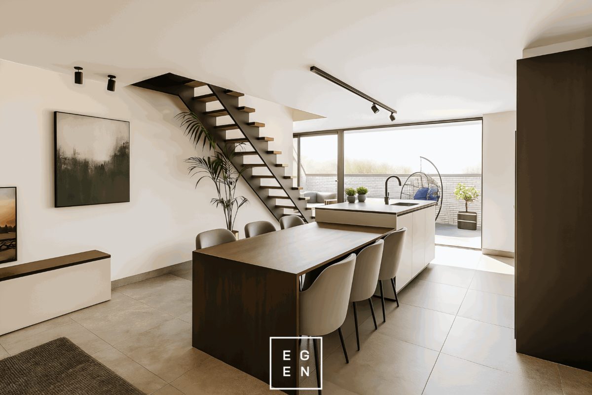Consultez egenvastgoed.be pour plus d’informations et pour planifier votre rendez-vous | À Oostkamp, au cœur d’une commune vivante, s’élève la Résidence Edgard, une résidence neuve à taille humaine comprenant quatre appartements et un espace de bureaux. Pas un bloc anonyme, mais un immeuble contemporain qui s’intègre harmonieusement au tissu villageois. De grandes fenêtres, des terrasses spacieuses orientées sud-ouest et une architecture soignée apportent lumière, espace et confort de vie. Grâce à sa localisation centrale, vous avez tout à proximité: commerces, écoles, horeca et transports publics sont accessibles à pied en toute simplicité. Les appartements sont conçus avec le souci de la qualité et de la convivialité. Les séjours ouverts communiquent naturellement avec la salle à manger et la cuisine et donnent un accès direct à la vaste terrasse avec vue sur le jardin intérieur. Les cuisines, modernes et fonctionnelles, sont équipées d’appareils de qualité ; les salles de bains bénéficient de finitions soignées avec des matériaux contemporains ; les chambres, quant à elles, offrent un espace propice à la détente. Les acquéreurs sur plan disposent en outre de la possibilité de personnaliser leur appartement et même de repositionner certaines cloisons non porteuses. La durabilité constitue un atout majeur : l’enveloppe du bâtiment est parfaitement isolée ; les appartements sont équipés de pompes à chaleur, de panneaux photovoltaïques et d’un système de ventilation double flux (système D). Grâce à des équipements économes en eau et à la récupération des eaux de pluie, vous vivez ici de manière à la fois économe en énergie et confortable. À l’arrière, six emplacements de parking sont prévus, dont trois sous carport, ainsi que quatre caves de rangement. Grâce à sa luminosité, à ses volumes, à son confort et à son emplacement central, la Résidence Edgard offre un chez-soi dont on perçoit la valeur ajoutée au quotidien.