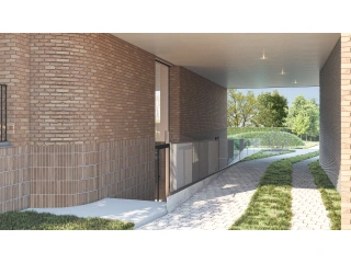 Le design élégant de CAAN Architects combine des briques de façade légères, des menuiseries élancées et des terrasses intérieures pour une sensation d'aération. L'abri à voitures commun avec toit vert renforce le caractère vert de la zone.