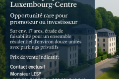 Deze unieke gelegenheid biedt een zeer potentieel stuk grond gelegen in het hart van Luxemburg, ideaal voor ontwikkelaars of investeerders die willen profiteren van de gunstige locatie en de toekomstgerichte aanpak. Het betreft een perceel van ongeveer 17 are, verdeeld over meerdere afzonderlijke kavels, gelegen in een rustige, groene en residentiële omgeving. Het terrein bevindt zich op een doodlopende straat zonder inkijk, wat bijdraagt aan de privacy en het exclusieve karakter van het project. Volgens een haalbaarheidsstudie kan op deze locatie een hoogwaardig wooncomplex gerealiseerd worden, bestaande uit meerdere kleine wooneenheden met privéparkeergelegenheid. De geschatte totale bewoonbare oppervlakte ligt tussen ongeveer 1.100 en 1.200 m², aangevuld met buitenruimtes zoals terrassen en balkons die gezamenlijk circa 180 m² beslaan. Dit alles vormt de basis voor een cohérent en elegant bouwvolume dat perfect aansluit bij een premium vastgoedproject. De ligging is bijzonder aantrekkelijk vanwege de nabijheid van het stadscentrum, terwijl het terrein zich bevindt in een rustige, niet-overstromingsgevoelige wijk, weg van drukke verkeersroutes en met alle voorzieningen binnen handbereik. Het project ligt in een verkaveling zonder uitrit, wat de privacy versterkt en een exclusieve woonervaring garandeert. Gezien de exclusieve aard van dit aanbod wordt het project strikt off-market aangeboden; Details zoals exacte adressen, plannen en de volledige haalbaarheidsstudie worden enkel gedeeld na het ondertekenen van een vertrouwelijkheidsverklaring (NDA) op kantoor. Interessenten worden uitgenodigd om contact op te nemen met de exclusieve contactpersoon voor verdere informatie en om een afspraak te maken, zodat discreet en professioneel het volledige dossier kan worden besproken. De vraagprijs voor dit prestigieuze bouwperceel bedraagt €4.500.000, een investering die niet alleen potentieel biedt voor significante waardestijging maar ook voor het realiseren van een hoogstaand woonproject in een gewilde omgeving. Voor wie op zoek is naar een exclusieve ontwikkelingskans in Luxemburg en bereid is om vertrouwelijkheid en professionaliteit te waarderen, is dit de ideale gelegenheid om zich verder te verdiepen in de mogelijkheden die dit terrein biedt. Neem vandaag nog contact op met de contactpersoon om uw interesse kenbaar te maken en de eerste stappen te zetten richting een potentieel waardevol vastgoedproject in Luxemburgs centrum. Meer weten?