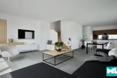 Deze woning in Hellange biedt een veelzijdige optie voor kopers die op zoek zijn naar een modern en functioneel woonhuis. De woning bestaat uit twee onafhankelijke appartementen, elk met hun eigen ingang, waardoor het ideaal is voor multigenerationeel gebruik of verhuur. Het totale bruikbare oppervlak bedraagt ongeveer 150 m², waarvan circa 140 m² woonruimte, verdeeld over twee verdiepingen. Op de begane grond bevinden zich vier parkeerplaatsen, waarvan twee binnen en twee buiten, evenals een technische ruimte. Het eerste appartement op de eerste verdieping heeft ongeveer 79 m² en beschikt over een ruime leefruimte van circa 35 m² die aansluit op een terras en een tuin van ongeveer 340 m². Het omvat twee slaapkamers van circa 12 m² elk, een badkamer en een praktische wasruimte. Het tweede appartement op de tweede verdieping heeft ongeveer 71 m² en bestaat uit een open keuken en woonkamer van circa 34 m², één slaapkamer van ongeveer 11 m², een badkamer, een apart toilet en eveneens toegang tot een terras. De woning is voorzien van moderne voorzieningen zoals vloerverwarming, een energiezuinige warmtepomp, triple glas PVC-ramen en een dual-flow ventilatiesysteem. De constructie en afwerking voldoen aan hoge energie- en comfortstandaarden, met onder andere betegelde of parketvloeren, en interne schilderwerken inclusief. De ligging in Hellange ligt in de gemeente Frisange, nabij diverse voorzieningen en met goede bereikbaarheid. De verwachte oplevering ligt tussen 15 en 18 maanden na ondertekening van de notariële akte. Meer weten?