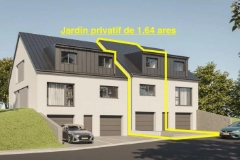 Wiesen-Piront vous offre: Un appartement-duplex (lot B) dans une maison bi-familiale (côté gauche) en future construction à NZEB (Nearly Zero Energy Building) avec un jardin privatif de 2,94 ares dans la rue "Réimercherwee" à Welfrange. *** PROJET AUTORISE & JARDIN PRIVATIF DE 2,94 ARES*** La maison est dotée d’une architecture moderne et cet appartement-duplex dispose d'une surface totale de 156 m2 dont 112m2 habitables. Ce bien se compose comme suit : Au rez-de-chaussée se situent un local technique, une cave privée et un garage privé qui peut accueillir 2 voitures. Le rez-de-jardin dispose d’un hall, d’un WC séparé, d’un salon et d’une cuisine ouverte donnant sur un vaste séjour avec accès à la terrasse et au jardin par une porte coulissante. L’étage se compose d’un hall de nuit, de 2 spacieuses chambres à coucher et d’une salle de bains. Prix: 908.813,-€ – 3% TVA inclus *)**) *** Prix non soumis à l’indexation *** *) sous condition d’acceptation par l’Administration de l’Enregistrement. Meer weten?