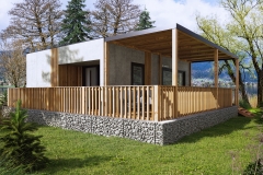 Deze vakantiewoning van 8 meter lang, 5,8 meter breed en 3,4 meter hoog oogt en voelt bij de eerste indruk al als thuis. De kleur antraciet versterkt de kwaliteitsrijke uitstraling van deze 4-persoons vakantiewoning nog meer, net als de houtlookelementen die aansluiten bij de bosrijke omgeving. Het terras, waar u vanuit de living zo opstapt dankzij de schuifdeuren, staat verder garant voor een mooi uitzicht over de Ossiacher See en de omringende bergflanken. Dit terras, dat rondom de vakantiewoning wordt gebouwd, is gemaakt van geïmpregneerd dennenhout, net als het hekwerk en de poort ertoe. Qua interieur is de voornaamste blikvanger de master bedroom die niet alleen ruim is, maar ook verrijkt is met twee kasten naast elke zijde van het tweepersoonsbed. Hangkasten, een spiegel en haakjes om de jas op te hangen vergroten het comfort nog meer. Een schuifdeur verschaft bovendien rechtstreeks toegang tot het terras. De tweede slaapkamer bestaat uit twee eenpersoonsbedden met daartussen een nachtkastje. Een kledingkast, hangkasten en kledinghaakjes kleuren deze ruimte verder in. De woonkamer is sfeervol te noemen met een zit- en loungehoek en een fraaie open keuken in een L-vorm. Deze keuken bestaat uit een kraan met rvs spoelbak, een vaatwasser, een inbouwkoelkast en -vriezer, een ingebouwde magnetron en een afzuiging boven de kookplaat. De toegangsdeur verschaft rechtstreeks toegang tot de living. Wie doorloopt treft in de hal tussen de woonkamer en de slaapkamers de badkamer. Deze is ingericht met een ruime douchecabine, toilet en wastafel met fontein en spiegel. Naast de badkamer is een tweede toilet in een separate ruimte. Meer weten?