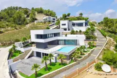 Gloednieuwe, moderne nieuwbouw villa met panoramisch uitzicht op zee te koop in de urbanisatie Cansalades Tosalet 5 in Javea aan de Costa Blanca van Alicante in Spanje, verdeeld over 3 verdiepingen met 350 m² gebouwd op een perceel van 1000 m², bestaat uit een volledig uitgeruste open keuken, eet en woonkamer, 3 slaapkamers, 3 badkamers, een berging, Zwembad en barbecue, garage voor 2 auto's. Uitgerust met vloerverwarming en geleide airconditioning, satelliettv, LEDverlichting, domotica en alarmsysteem. Meer weten?