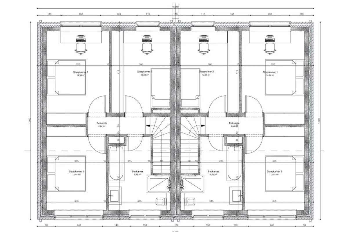 Op de eerste verdieping bevinden zich drie volwaardige slaapkamers (14,54 m², 12,44 m² en 12,39 m²), een moderne badkamer, en een nachthal.