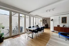 Dicht bij het Parvis van Sint-Gillis, biedt dit gemeubileerde loft, gelegen op de eerste verdieping van voormalige ateliers die zijn omgebouwd tot woningen, een unieke en rustige woonomgeving, toegankelijk via een boomrijke binnenplaats aan de achterzijde van het gebouw. Bij binnenkomst opent een ruime hal op een mezzanine-kantoor en loopt door naar een slaapkamer gescheiden door een glazen wand, wat zowel licht als privacy biedt. De royale leefruimte omvat een open keuken met een centraal eiland, een zithoek en een eetgedeelte, met directe toegang tot een groot, naar het zuiden gericht terras. Een technische ruimte met wasmachine en droogkast maakt het comfort van de woning compleet. De nachthal geeft toegang tot twee slaapkamers, waaronder een master suite met dressing en kantoorruimte die ook toegang geeft tot het terras, evenals een moderne badkamer met bad en douche. Het toilet is apart. Het loft is uitgerust met een individuele gasboiler voor verwarming en warm water, een waterontharder en een zonnescherm dat het hele terras bedekt. Gemeenschappelijke kosten bedragen €150 per maand voor het onderhoud van de gemeenschappelijke delen. Direct beschikbaar, huurcontract gewenst voor 3 jaar. Winkels, cafés, lokale boetieks en openbaar vervoer bevinden zich op directe afstand. Informatie en bezoeken: ### Meer weten?