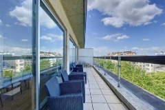Omschrijving: Licht, gemeubileerd duplex penthouse gelegen op de 7e verdieping met een fantastisch uitzicht, op de Winston Churchilllaan, en een steenworp afstand van het Ter Kamerenbos en La Bascule. Dit appartement is perfect voor een co-living of een groot gezin. Indeling: Inkomhal met veiligheidsdeur en gastentoilet. Woonkamer, eetkamer aan de voorzijde met parketvloer en een ingerichte open keuken, allen met toegang tot een prachtig eerste terras. Ingerichte wasruimte. Nachthal met 3 slaapkamers, waarvan één met een en-suite badkamer met douche. Elke slaapkamer komt uit op het tweede terras. Complete badkamer met bad, douche, wastafel en toilet. Op de bovenverdieping : 2 andere slaapkamers met een douche kamer. Kelder en garage voor 1 auto optioneel Meer weten?