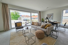 Gelegen op het gelijkvloers vinden we dit ruim en lichtrijk appartement terug met 2 slaapkamers en private tuin! Het appartement is volledig afgewerkt met oog voor kwaliteit afwerking en comfort! Uniek aan dit hoekappartement is zeker en vast de grote raampartijen! Ruimte is hier zeker troef met maar liefst 108m² bewoonbare oppervlakte! Qua indeling vinden we volgende zaken terug: Inkomhal Gastentoilet Open leefruimte met keuken (47m²) Berging (5,10m²) Nachthal Badkamer (5m²) Slaapkamer 1 (+- 15m²) Slaapkamer 2 (+- 10m²) Terras (+- 21m²) Tuin met poortje Het appartement is volgens het BEN-principe opgericht = 5 jaar vrijstelling onroerende voorheffing. Nog een pluspunt: het appartement valt onder de 6% BTW-regelgeving! Meer weten?