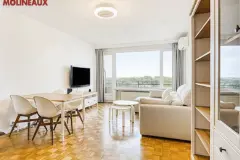 MAGNIFIQUE APPT., ENTIÈREMENT RÉNOVÉ avec VUE EXCEPTIONNELLE & DÉGAGÉE, 61 m² + 2 Terrasses 9 m², au 11 étage sur 12 avec vue imprenable sans vis-à-vis. Parfaitement agencé dans un bel immeuble très bien entretenu « Résidence Maillol », situé en bordure du quartier prisé et verdoyant ‘Heymbosch’ avec circulation limitée. À quelques pas du Bois de Dieleghem et le Parc Baudouin, avenue de l’Exposition 440 à Jette (accès par l’avenue Henri Liebrecht). AGENCEMENT : Appt. agréablement aménagé avec bon goût. Hall d’Entrée avec coin Vestiaire. Beau Séjour 25 m² baignant dans un afflux de luminosité, avec F.O. et donnant accès à la belle Terrasse attenante (3m95 x 1m25) orientée Sud-Est. Belle Cuisine 6 m², semi-ouverte et plus que bien équipée. Une Chambre spacieuse 16m² (3m75 x 4m31) et belle Terrasse attenante (3m95 x 1m05). Salle de Douche spacieuse plus que correctement équipée. Finalement l’appartement vous offre une Toilette séparée, ainsi qu’une Cave au sous-sol. ÉLÉMENTS TECHNIQUES : Appt. prêt à emménager. Rénovation entière àpd. 2023 : Cuisine avec bon nombre d’armoires encastrées, cuisinière à induction, hotte, four, frigo/congélateur sép. ; Salle de Douche, meuble-lavabo, armoire, miroir et coin Buanderie avec raccords Machine à laver et Séchoir ; Toilette ; système de Climatisation DAIKIN. - Vidéophone. Châssis Doubles Vitrages récents oscillo-battants. Portes fenêtres avec moustiquaires. Réel Parquet dans le Séjour et le Hall d’Entrée. Chauffage central récent (2022) à condensation au Gaz. Électricité conforme. Ascenseur conforme. Certificat Énergétique « E ». Local Poubelles et Local Bicyclettes à disposition. - Excel. Investissement ou Premier Achat. Charges modérées. EXCEL. SITUATION : Quartier résidentiel prisé, calme et verdoyant, parking aisé et circulation limitée. Situation idéale et agréable à proximité de l’UZ Brussel, de la VUB-Campus Jette et à qlqs pas de plusieurs espaces verts de quartier ; le site de Heymbosch et le Parc Liebrecht. Près des magasins, crèches, écoles, … . Accessibilité aisée par transports privés que collectifs. Excel. communic. Ring - E19 - E40 - E411 - A12. Meer weten?
