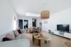 Hall d'entrée, Salon, Salle à manger, Cuisine ouverte équipée (Taque, hotte, four, lave-vaisselle), Salle de bain (Double vasque, douche italienne, baignoire et WC), Espace buanderie, Garage 2 voitures avec porte motorisée, Belle terrasse en bois et petit jardin clôturé, sans vis-à-vis, Cave. Au 1er étage : 2 grandes chambres (Dont 1 avec un grand dressing sur-mesure) Un WC séparé Un espace rangement (Avec évacuation pouvant accueillir une douche) Au 2e étage : Un grenier aménageable. Caractéristiques : A proximité des commerces, écoles et du centre-ville. Très grande pièce de vie. Carrelage au RDC, parquet à l'étage. Spots encastrés dans l'ensemble de la maison. Menuiserie PVC double vitrage. Chauffage au gaz de ville. Volets roulants en façade avec télécommande. Meer weten?
