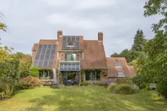 Postmodernisme in het groen In een doodlopende straat tussen de velden ontdek je deze bijzondere postmodernistische parel gecreëerd door architect Etienne Hoeckx, die een uitzonderlijke aandacht schonk aan bio-ecologische materialen & bouwwijze voor een zo gezond mogelijke leefomgeving. Ook de tuin is doordacht aangelegd als oase van rust, natuurlijk en klimaatvriendelijk, met een variatie aan bloemen, struiken, gezellige zitplekjes en grote bomen, een speelparadijs voor kinderen en een schuilplaats voor vele diertjes. Het adagium ‘locatie locatie locatie’ is hier 100% van toepassing: vlakbij de oprit Zemst van de E19 Antwerpen-Brussel, bij school/sport/recreatie, op fietsafstand van supermarkt/bakker/apotheek/huisartsen, etc, en toch landelijk, stil en in het groen. De woning kenmerkt zich door kleine niveauverschillen, architecturale assen en hoeken, leuke details zoals de opvallende lichtschakelaars, en veelvuldig gebruik van hout als natuurlijk isolerend materiaal dat een warme sfeer creëert als tegenhanger van de ruwe steen die op vele plaatsen zichtbaar gebleven is. Het is een zeer ruime woning (+/-342m² bruto bewoonbare opp.) die erg goed onderhouden wordt en waarin blijvend geïnvesteerd werd, met zonnepanelen, , nieuwe ramen met 3-voudig glas en aluminium profielen, nieuwe gascondensatieketel, regenwater- en geboorde put, kelder, wijnkelder en zolder, en die een bijzonder gunstig EPC B scoort! INDELING: GELIJKVLOERS: Inkomhal met vide, vestiaire en gastentoilet Aparte bureauruimte aan de ingang die voor verschillende doeleinden gebruikt kan worden (praktijkruimte voor zelfstandige/vrij beroep, thuiswerken, etc) Een grote ‘splitlevel’ leefruimte: lager gelegen eetkamer met zicht op terras en tuin, en een hoger gelegen gedeelte als gezellige zithoek, mèt een aparte cosy TV-zithoek opzij Een ruime keuken met toog en eettafel, met buitendeur Een ruime bijkeuken en wasplaats Een koele berging met toegang naar de recent vernieuwde kelder en wijnkelder Dubbele & diepe garage met grote zolder als opbergruimte, met buitendeur VERDIEPING: 4 slaapkamers waarvan 3 met eigen lavabo en 1 met terras en grote schuiframen Een grote badkamer met dubbele lavabo, recente inloopdouche en ligbad ZOLDER: Vaste trap naar 2 zoldertjes en een 5 e ruime slaap-of hobbykamer TROEVEN: locatie: doodlopend, stil, in het groen en toch overal dichtbij grote bewoonbare opp met veel ruimtegevoel, 5 slaapkamers + bureauruimte glvl + aparte zithoek + veel praktische ruimte rond keuken oprit voor 3 wagens en zeer ruime dubbele garage EPC B en veel duurzame ingrepen uitgevoerd gezellige woning door de verschillende niveauverschillen en materialen veel modaliteiten: thuiswerk, aparte praktijk, ombouwbaar tot beneden wonen, etc grotendeels instapklaar & zeer goed onderhouden heerlijk grote tuin, een paradijs voor jong & oud, fauna & flora Zin om deze unieke woning te komen ontdekken? Maak je afspraak via ### of ### ***asbestattest & elektrische keuring in aanvraag*** Meer weten?