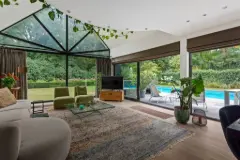 Riante villa met praktijkruimte, zwembad en parktuin in groene omgeving! Beschrijving: U betreedt de villa via een ruime inkomhal met gastentoilet en trap naar de verdieping. De riante en gezellige living met open haard bestaat uit een TV-hoek en eetkamer, beiden voorzien van een natuurstenen vloer. Aansluitend bevindt zich een volledig uitgeruste leefkeuken. De achterzijde van de woning verrast met een uitzonderlijk ruime en lichtrijke leefruimte met parketvloer en grote schuiframen, die een prachtig zicht bieden op het terras en de tuin. Op het gelijkvloers bevindt zich tevens een slaapkamer met ensuite badkamer. Op de eerste verdieping vinden we een ruime, lichtrijke bureauruimte. Deze is perfect geschikt als kantoor of praktijkruimte. Verder vindt u hier een ruime slaapkamer met dressing, ingemaakte kasten en een luxueuze badkamer met ligbad, douche, dubbele lavabo en toilet. De tweede verdieping biedt nog twee volwaardige slaapkamers en een volledig uitgeruste badkamer. De villa is vrijwel volledig onderkelderd en biedt tal van praktische ruimtes: bergruimtes, een wasplaats, een sanitaire ruimte met douche én een ontspanningsruimte die momenteel is ingericht als privécafé. De prachtige, omheinde parktuin straalt rust, ruimte en privacy uit. Achter de woning bevindt zich een ruim terras met zicht op het royale zwembad en een verzorgd poolhouse. Meer weten?