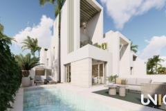 In La Herrada, een gezellige wijk binnen Los Montesinos, situeert zich dit wondermooi villaproject. Binnen dit project is er keuze tussen halfvrijstaande en vrijstaande villa’s. Bij deze halfvrijstaande villa’s is er lang nagedacht over het privacygevoel binnen deze commune. De architecten zijn met slag en wimpel geslaagd in deze opdracht: of u nu binnen of in de tuin bent, nooit heeft u het gevoel dat er überhaupt buren zijn. De leefruimte baadt in het zonlicht door de brede raampartijen, die uitgeven op het strak en onderhoudsvriendelijk terras.Een prachtig en ruim zwembad kan geïntegreerd worden mits een meerkost.Verder op het gelijkvloers is er een eerste slaapkamer en een badkamer terug te vinden. Op de eerste verdieping zijn er nog 2 ruime slaapkamers met telkens een badkamer ensuite. Dit brengt het totaal op 3 slaapkamers en 3 badkamers. Via de inwendige trap kan u het solarium van niet minder dan 32 m² betreden. Hier kan u dag in dag uit genieten van een zalige portie vitamine D.De villa’s worden standaard opgeleverd met LED-verlichting binnen en buiten, solarium, keukentoestellen en elektrische rolluiken.Een autostaanplaats is voorzien op het perceel zelf, achter de toegangspoort. La Herrada is een heerlijk rustige wijk, maar desondanks heeft u winkels, golf, zee, horeca, padel, … op zeer acceptabele rijafstand. Het beste van 2 werelden! Meer weten?
