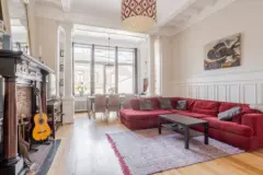 Ideaal gelegen op een steenworp van het Ambiorixplein en de Europese Instellingen, prachtig herenhuis van ± 380 m² bruto met een terras van ± 15 m². Het is als volgt samengesteld: Op de tussenverdieping: inkomhal van ± 6 m², volledig uitgeruste eetkeuken van ± 23 m², apart toilet en wasruimte. Op de verhoogde gelijkvloerse verdieping: overloop van ± 6 m², lichtrijke leefruimte van ± 35 m² met open haard en toegang tot het westgerichte terras, slaapkamer van ± 18 m² en apart toilet. Op de 1ste verdieping: twee slaapkamers van ± 25 en 16 m², elk met privé doucheruimte. Op de 3de verdieping: overloop die toegang geeft tot een appartement van ± 60 m² bestaande uit een lichtrijke woonkamer, een uitgeruste keuken, een slaapkamer van ± 16 m² en een badkamer. Op de 4de verdieping: overloop die leidt naar een tweede appartement van ± 50 m² met een lichtrijke woonkamer, uitgeruste keuken, twee slaapkamers van ± 16 en 9 m² en een badkamer. EPC: E. Eveneens: garagebox, bestemming eengezinswoning, bewaarde authentieke elementen, gasketels, opbergruimtes, mooie plafondhoogte. Mogelijkheid tot gemeubelde aankoop. Snel te ontdekken! Meer weten?